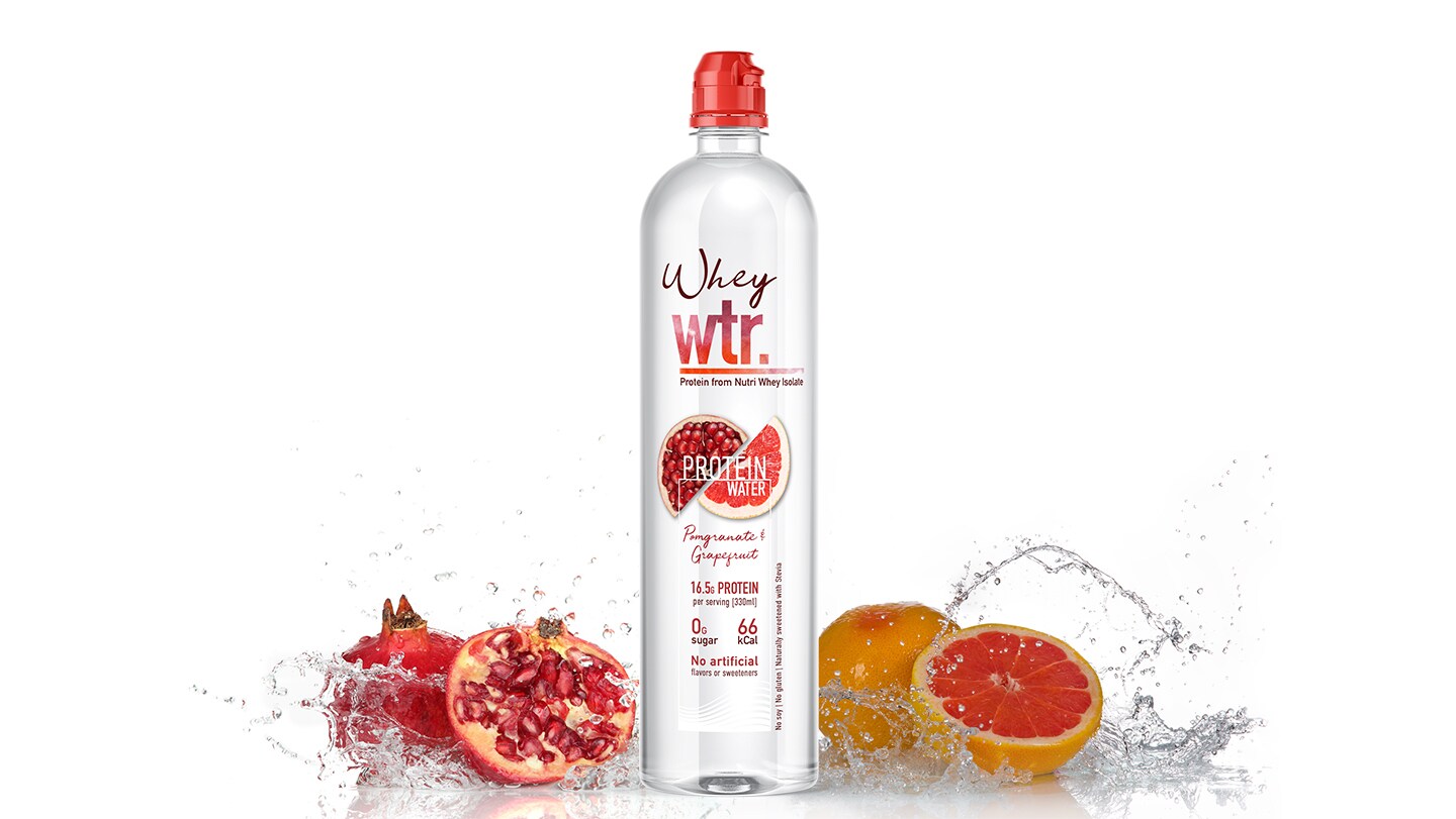 This clear protein water application suggestion combines the popularity of no-sugar water drinks with the functionality of protein. It meets the demands of the modern consumer by providing on-the-go convenience, low calories, great taste, lack of preservatives, and no artificial flavors or sugar. This suggestion offers two natural flavors: the rewarding Grapefruit & Pomegranate and refreshing Cucumber & Lime.